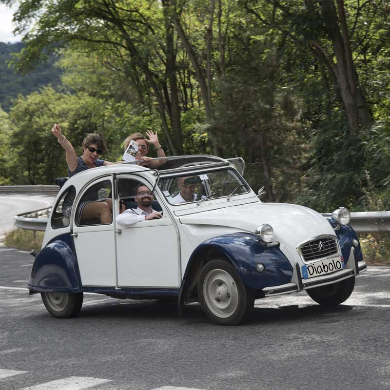 amis dans une 2cv bleu marine