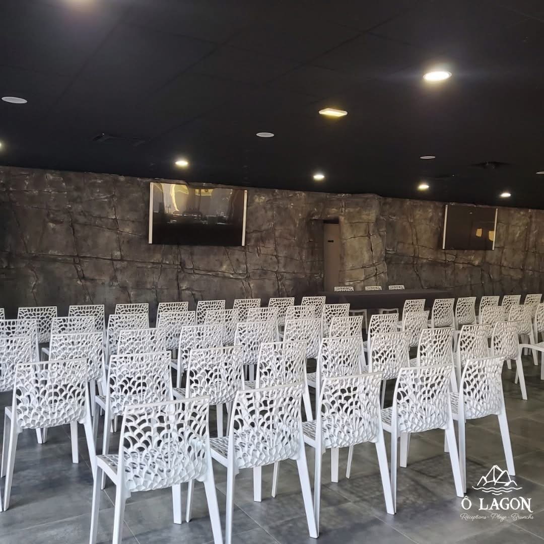 La décoration de O’ Lagon est soigneusement étudiée : moderne et raffinée, elle combine matériaux élégants et touches festives, offrant un équilibre parfait entre professionnalisme et convivialité. Chaque détail, du mobilier aux luminaires, contribue à créer un environnement inspirant où il fait bon travailler, réseauter et célébrer. L’espace modulable permet d’adapter la salle à vos besoins : plénière, ateliers, cocktails ou moments de détente, avec une fluidité naturelle entre intérieur et extérieur.